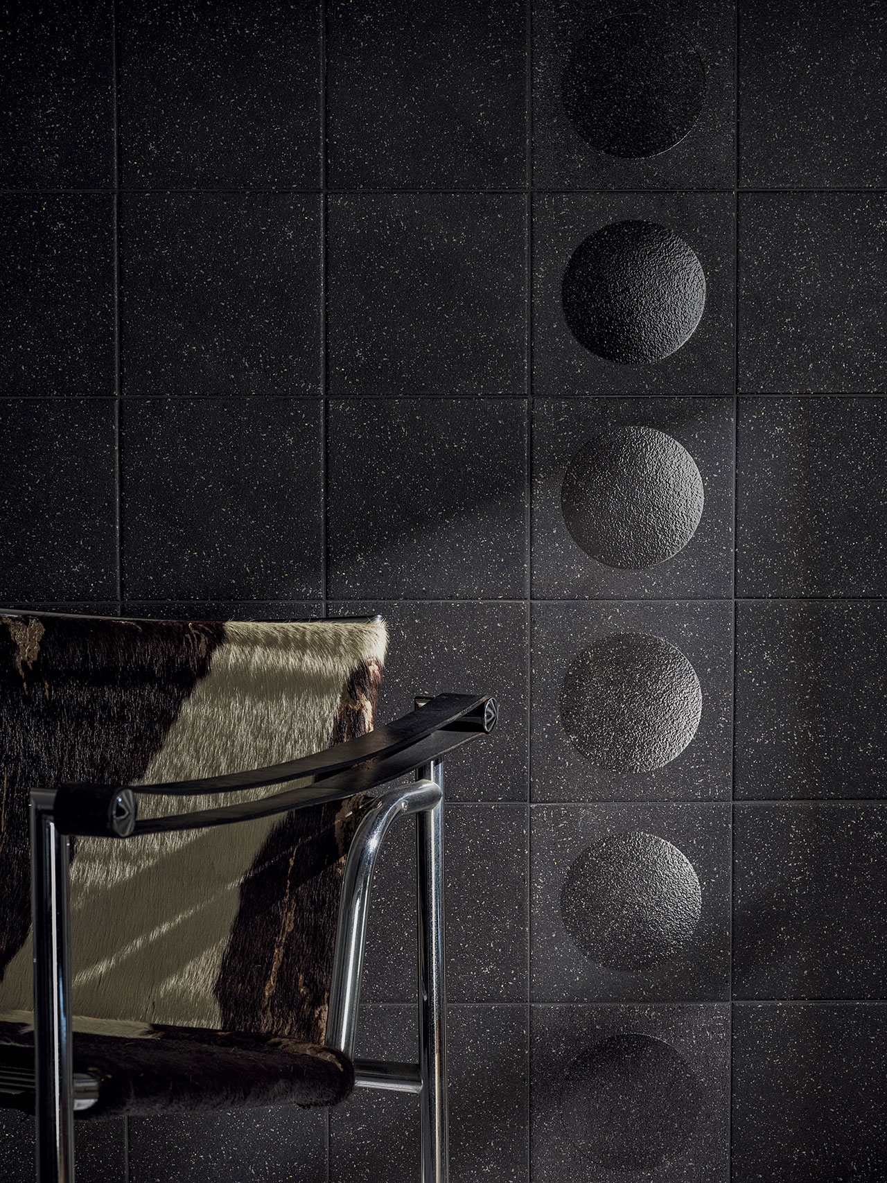 reinterpretacja klasycznego terazzo, dekoracyjne wzory graficzne („Gemstone”), efekty geometryczne („Bubble”) czy kontrast pomiędzy błyszczącym a matowym wykończeniem.